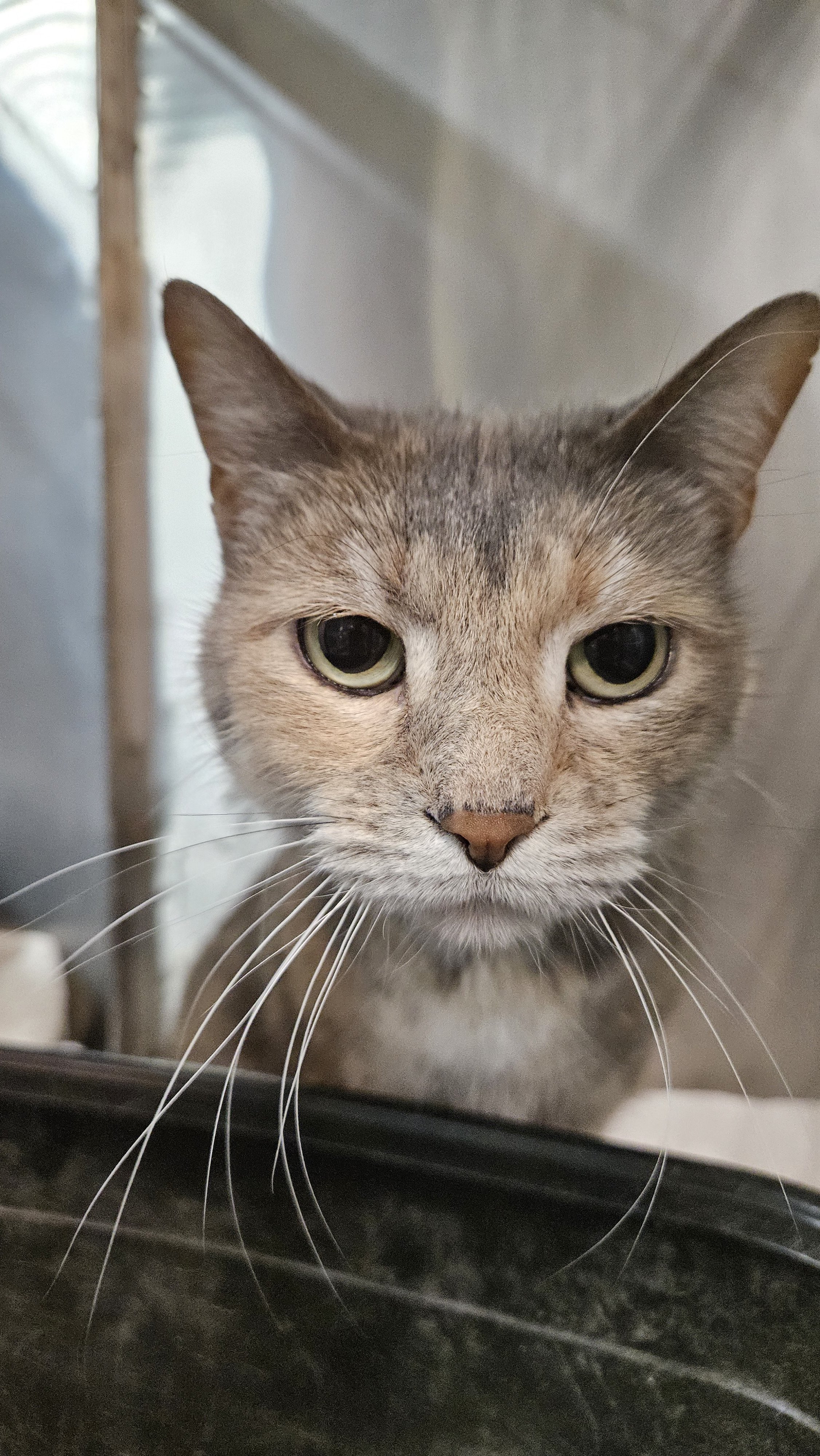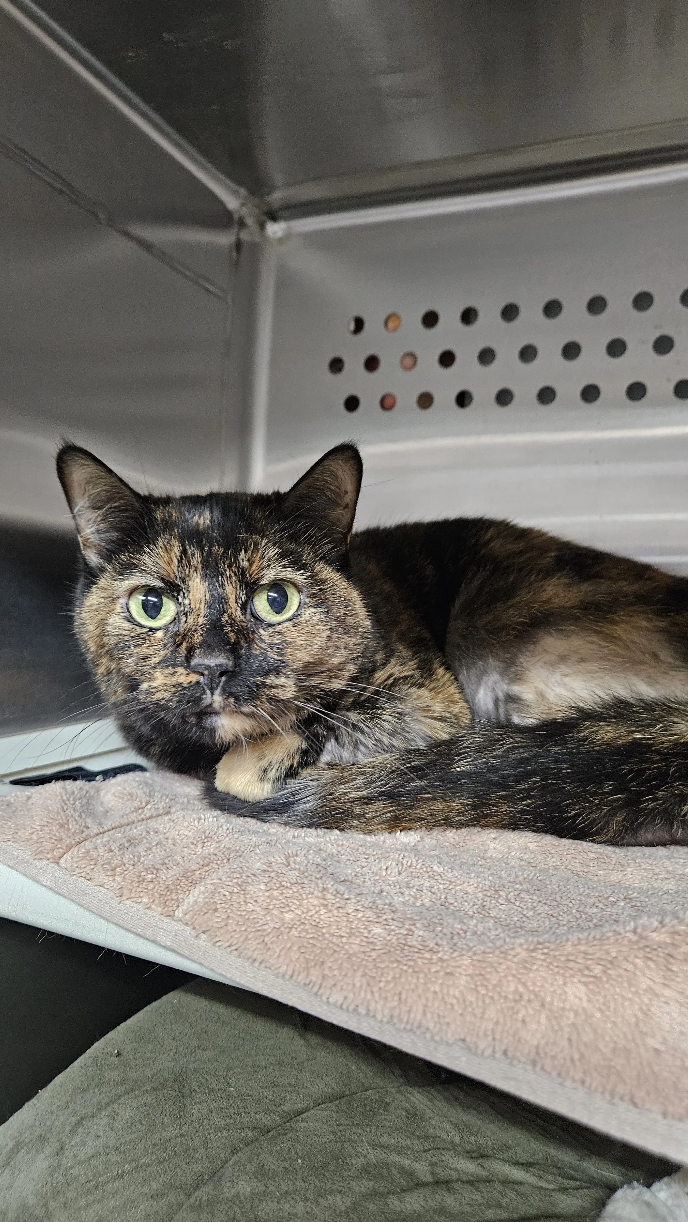 Esmeralda and her grey Tortie sister, Eleanor, were brought to us on April 4th, 2026. Their parents were expecting a baby and these cats are not fans of children (many attempts were made to get to know kiddos in the family) so they came to us. Esmeralda does lick when she’s stressed so she has some bald patches or spots with thin hair - she’s still a beauty though! Esmeralda would love to join an adult or two in a quiet home. The sisters don’t get along that well and if adopted together, would likely keep their distance in their new home.