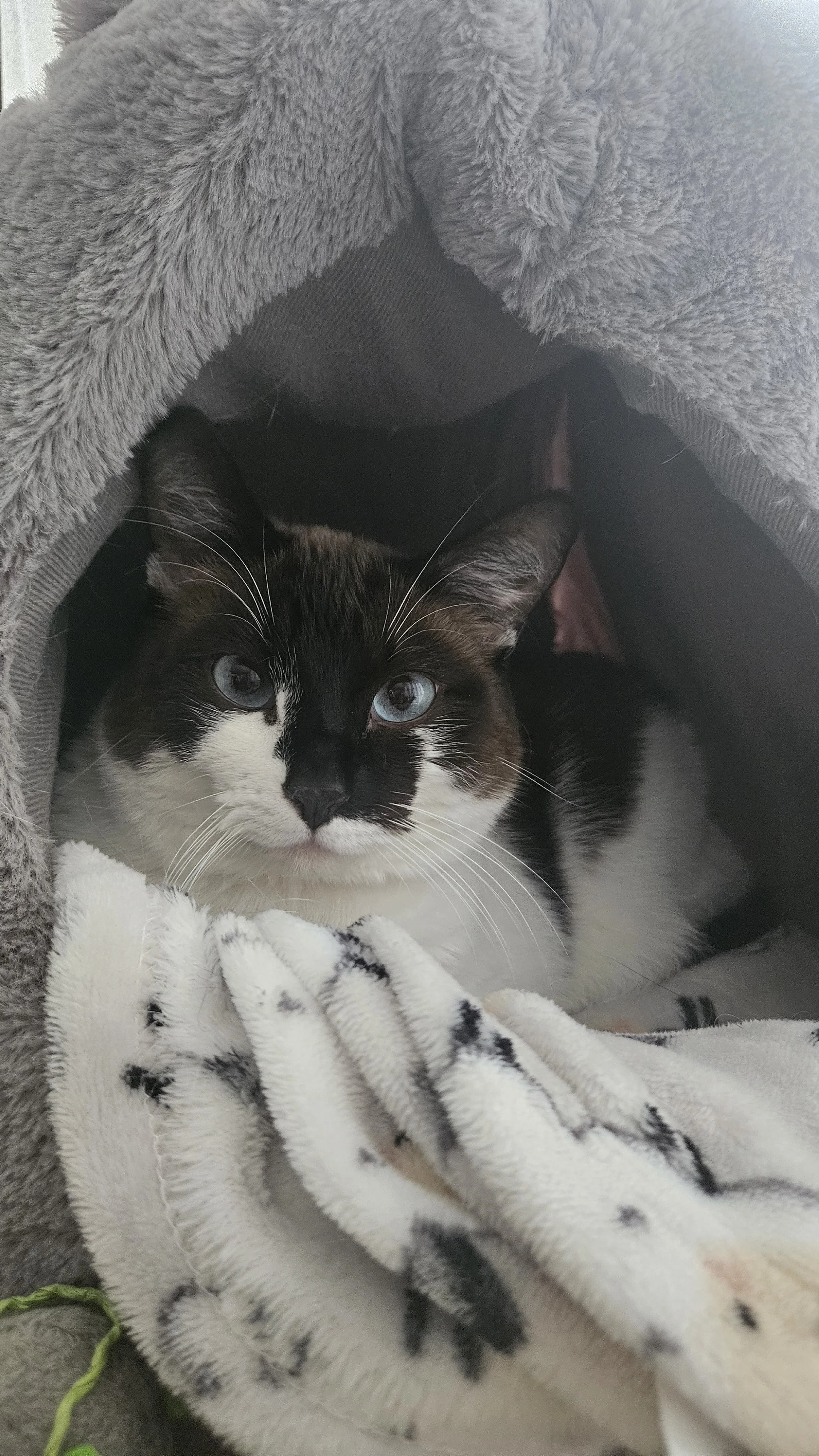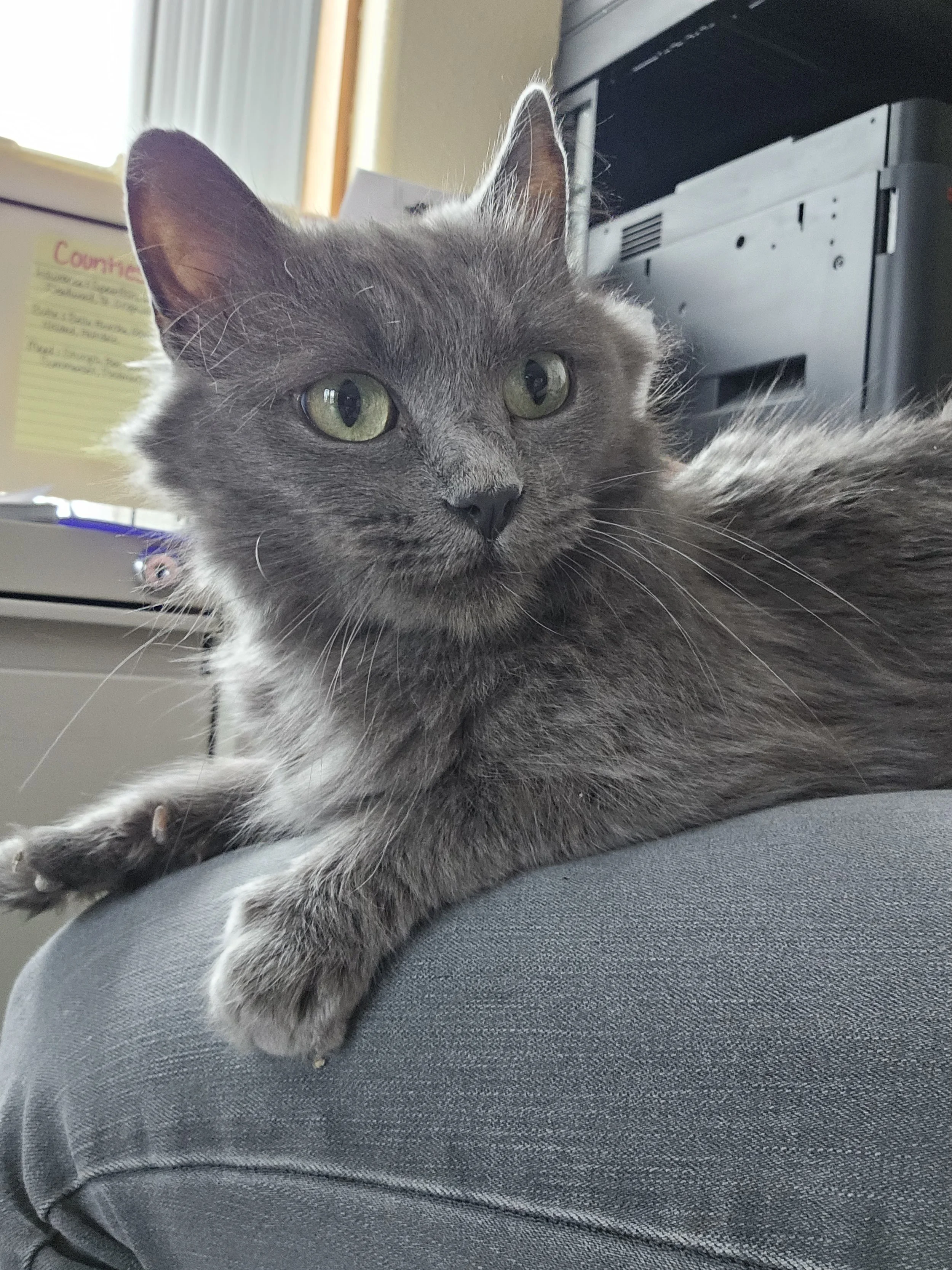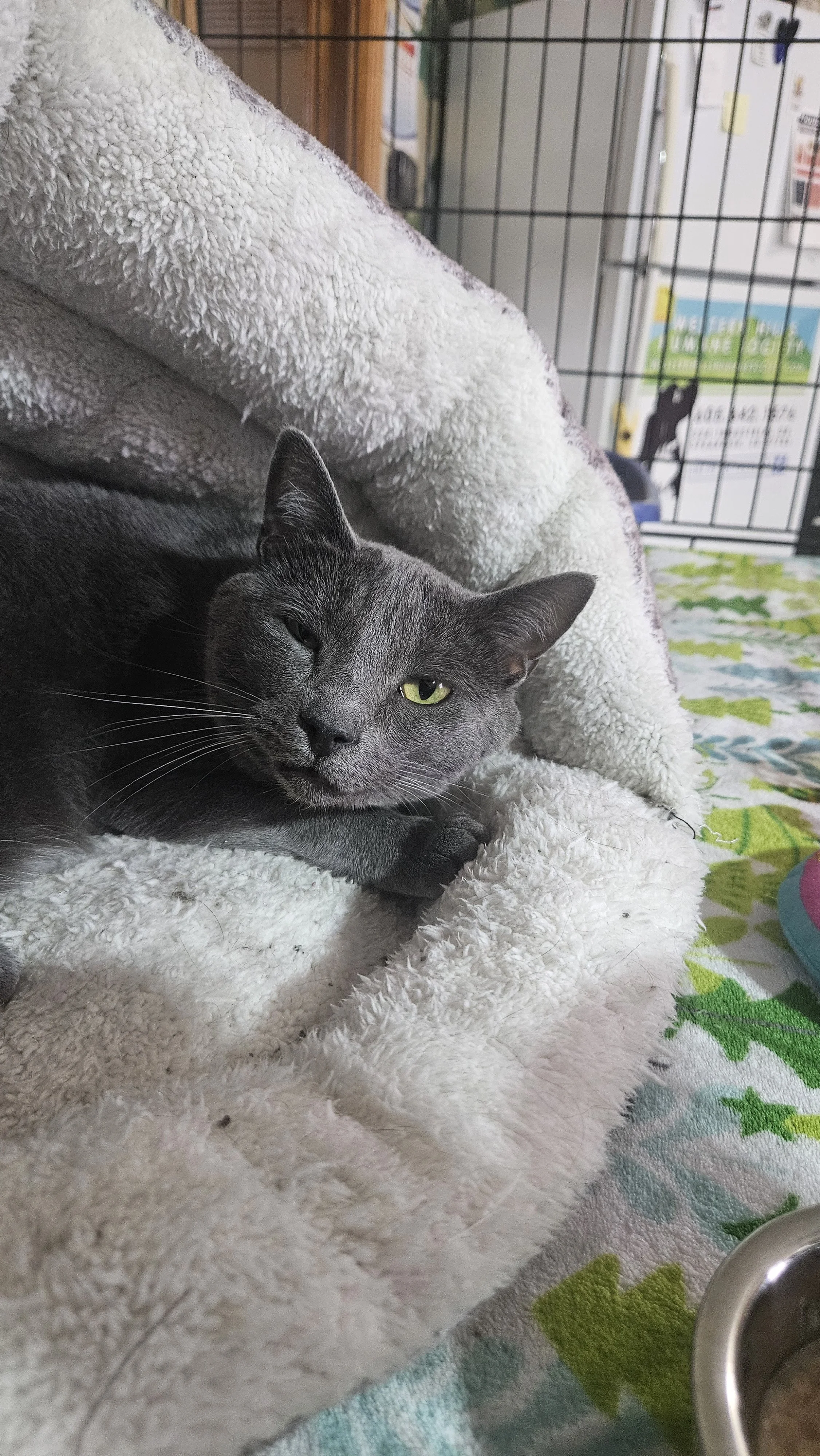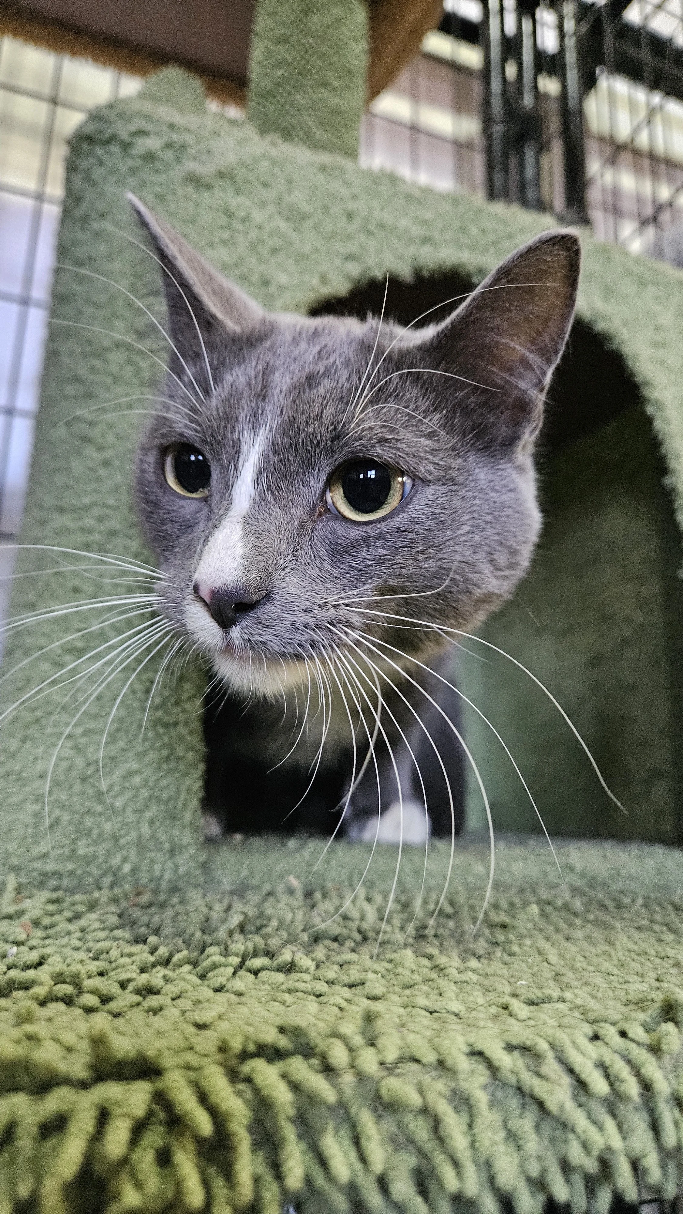 We got Smokey on 3.23.26. She is not a fan of children and that is why she is with us. Her last owners said she’s more of a night owl but loved to cuddle when the kids weren’t around. She even got along with a calm dog and would snuggle with it! She doesn’t enjoy being chased or playing with other cats/dogs. Her last owners said she enjoyed pawing at her water bowl and even dropping the occasional hunted sock into her water - what a silly girl!