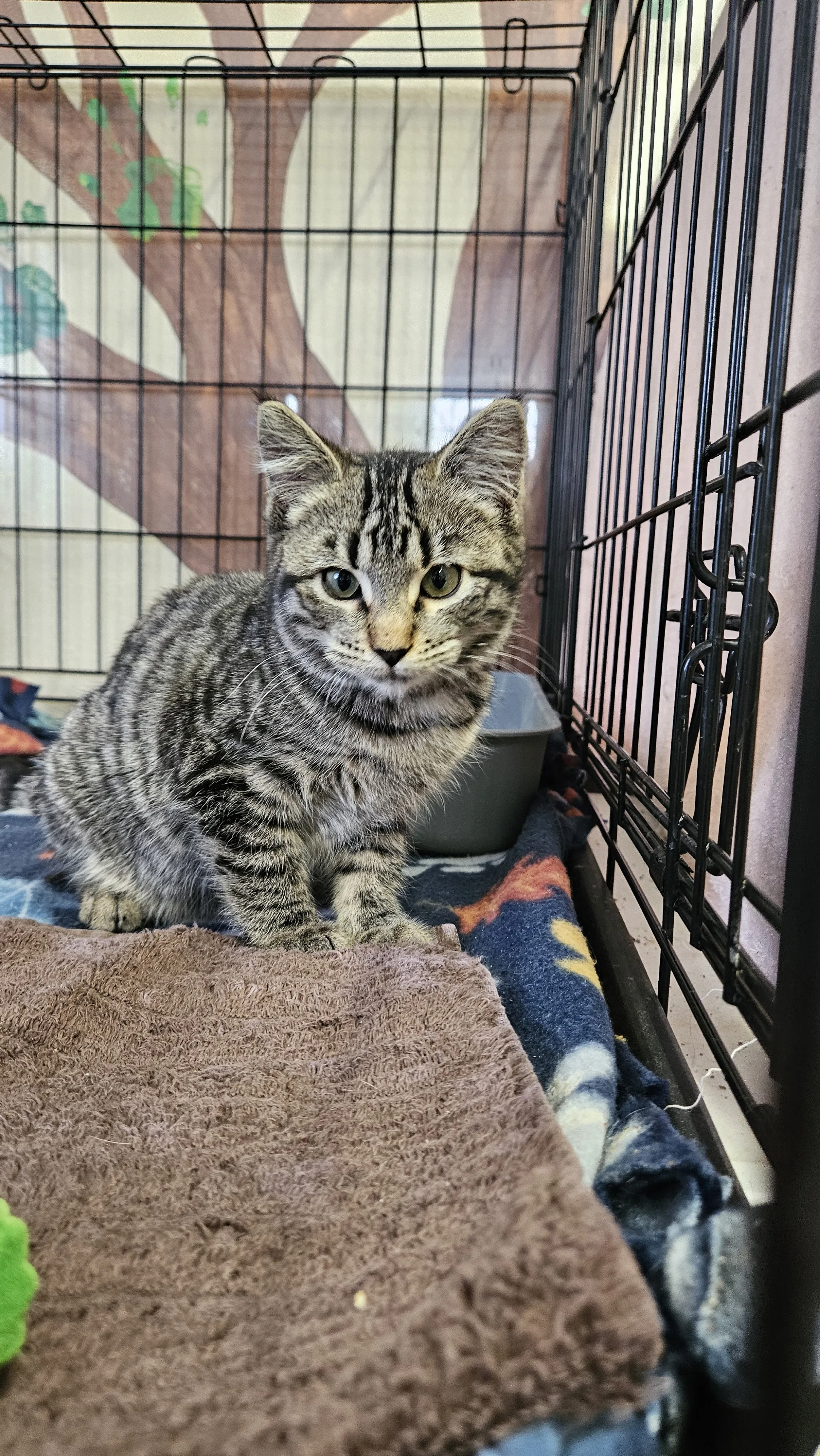 Drumstick came to us with her 2 siblings as strays in November 2025. The 2 siblings have been adopted but Drumstick is still here. She was very shy when she came in but has become very social and playful. She is currently our youngest and smallest kitty!