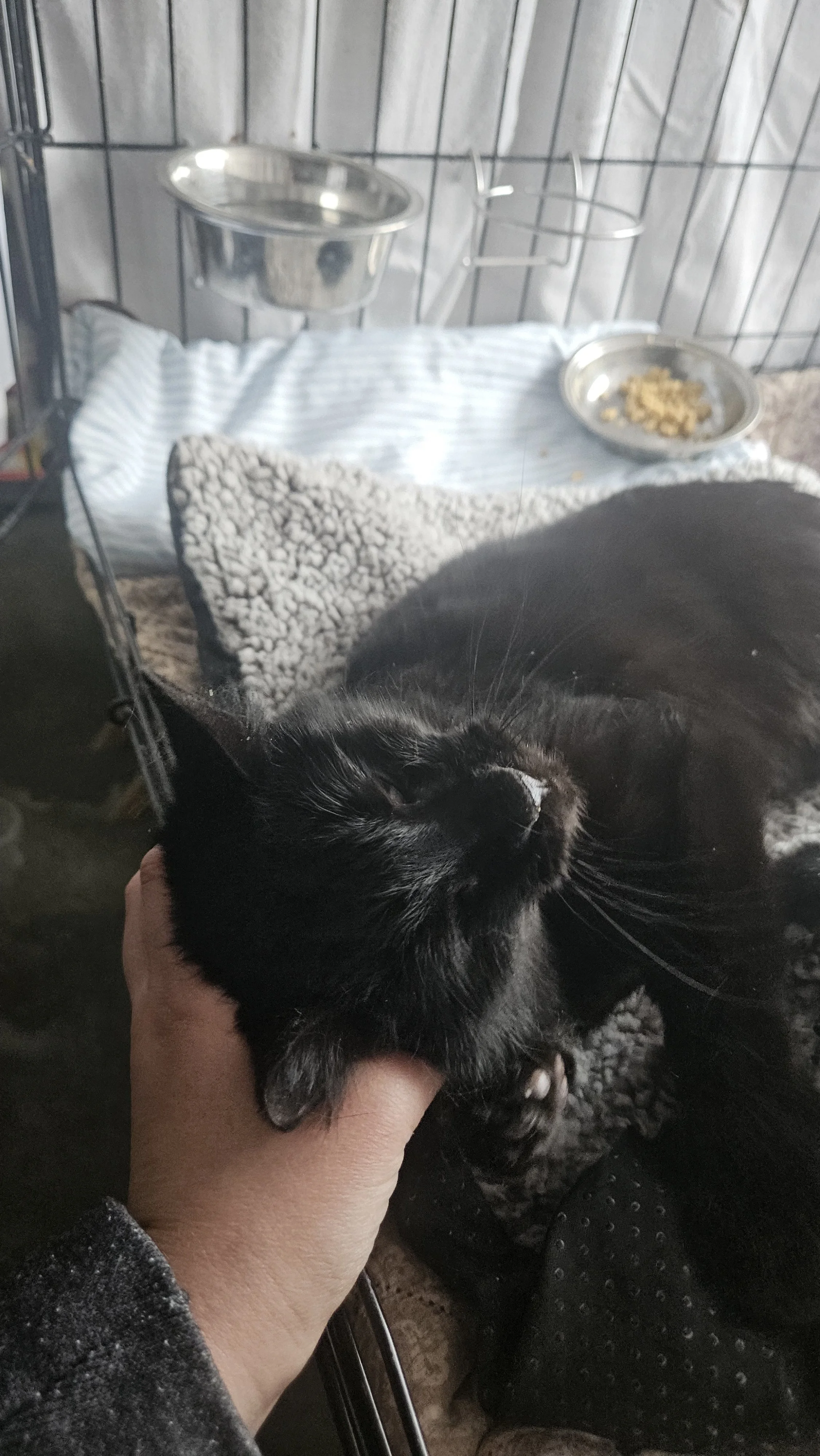 Cobweb was brought in as a stray in August 2025. She used to be shy but is now a big fan of attention and looks like a beautiful panther! She likes to snuggle up with her kennel mates and occasionally will play with some toys. Give her some pets - she’ll love it.