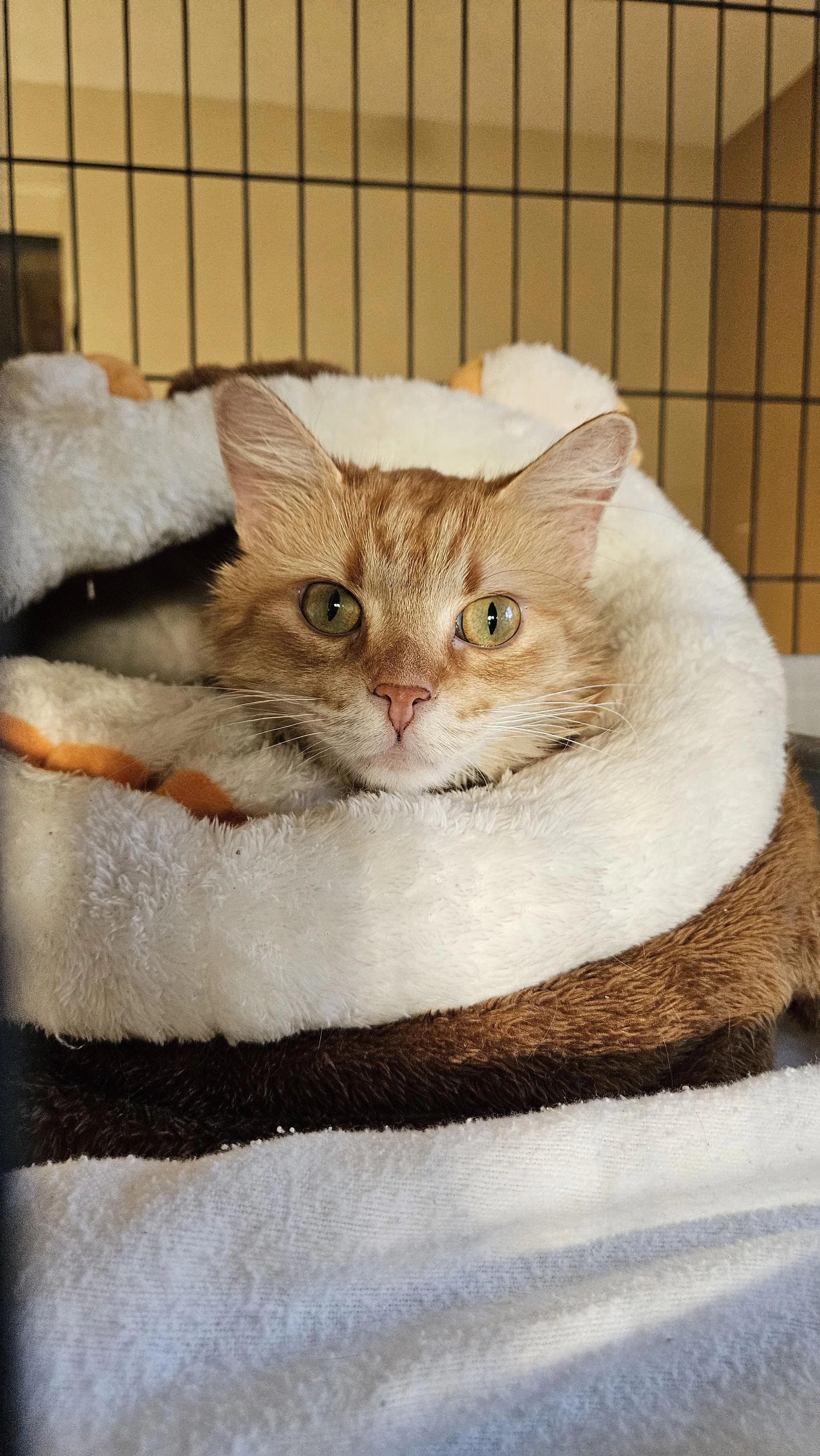 Cleo Catra came to us on 3.27.26. She is a sweet girl that adores pets and is just a little unsure in her new environment. Cleo does not like other animals and will pee on things if other animals are present in the home. She does not like big groups so would do best in a quiet home with fewer people. She might not do well with children either. She is affectionate to her human and it was a hard surrender for her former owner. Orange females are rare and she’s a total catch.